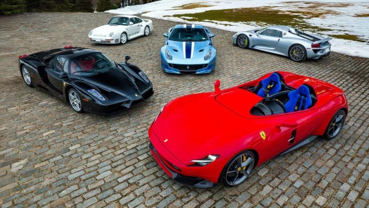 2003 Ferrari Enzo alongside a 2021 Ferrari Monza SP2, a 1988 Porsche 959 Sport, a 2015 Porsche 918 Spyder, and a 2017 Ferrari F12tdf